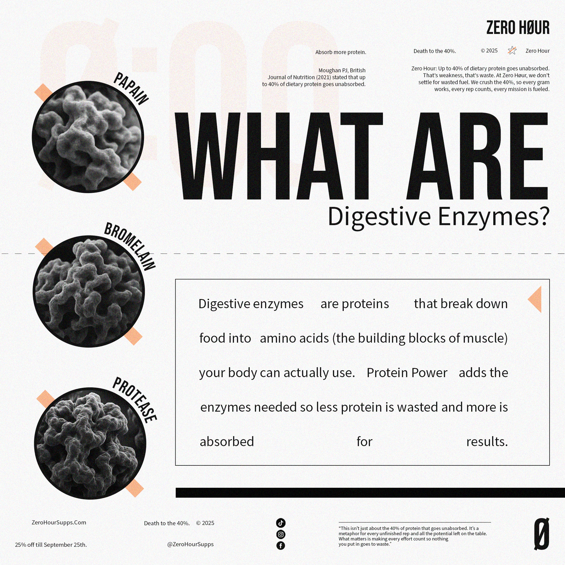 Enzymes are natural proteins that help your body break down food and absorb nutrients. Without enough digestive enzymes, much of your protein goes unused. Protein Power supplies targeted enzymes to improve protein absorption and utilization.