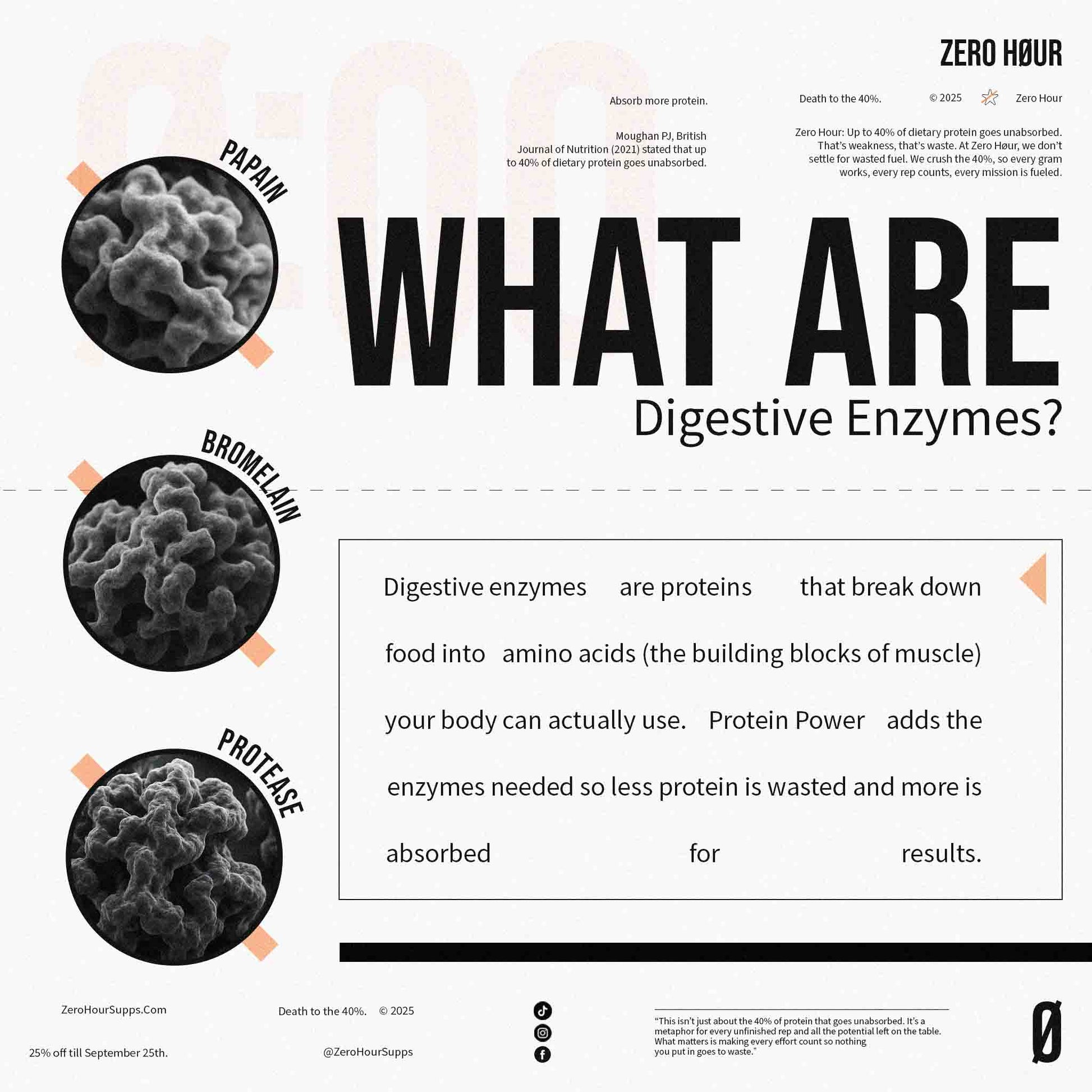 Enzymes are natural proteins that help your body break down food and absorb nutrients. Without enough digestive enzymes, much of your protein goes unused. Protein Power supplies targeted enzymes to improve protein absorption and utilization.